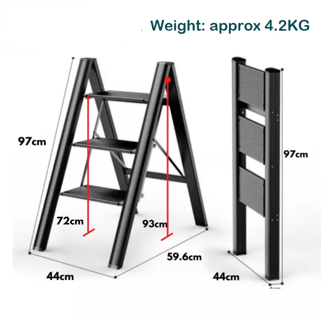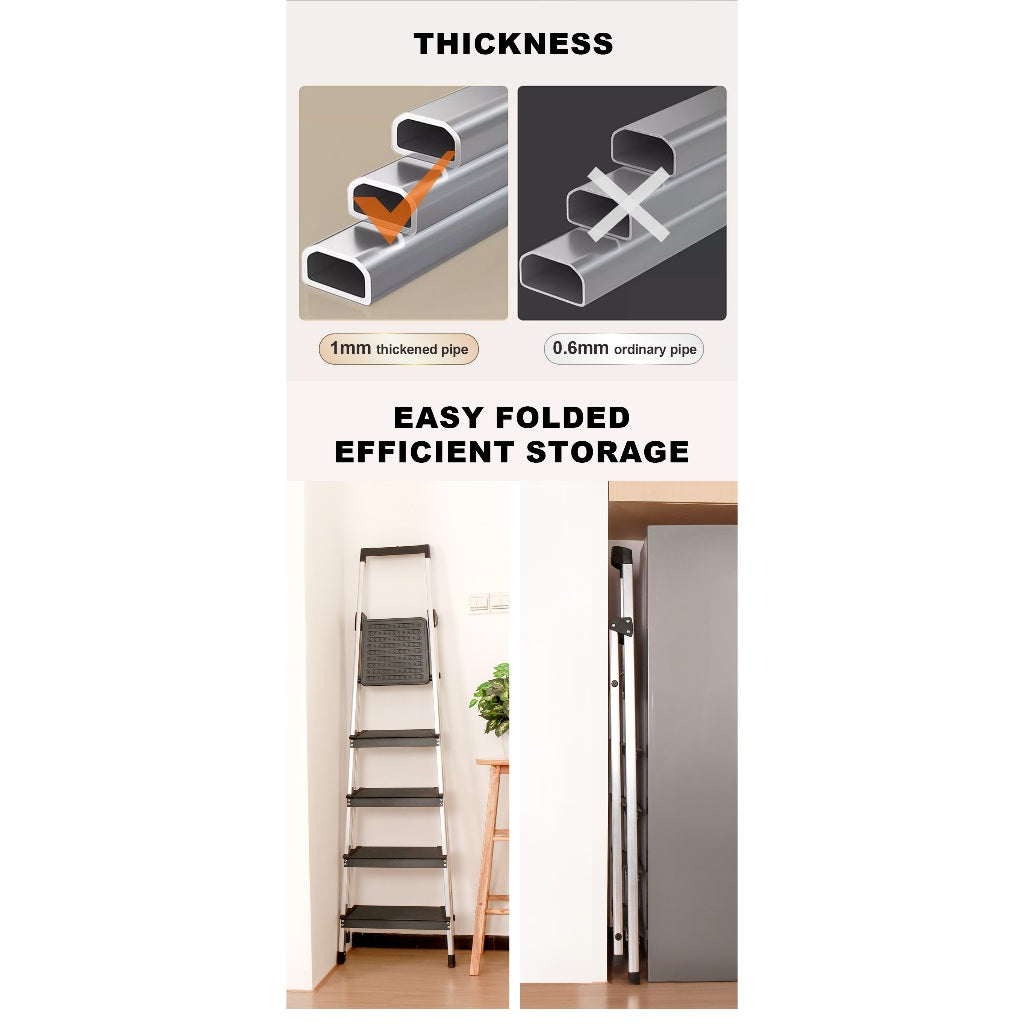 🍀🍀LIGHTWEIGHT & SPACE-SAVING – Space-Saving Design of stepladders folded to for storage. Folds compactly to fit in a narrow place,you can say goodbye to hefty steel ladder. With a lightweight aluminum construction and extra large non-slip rubber feets, you can easily set up and maneuver this ladder easily without scratching your hardwood floor. It is also a perfect gift for elderly parent!