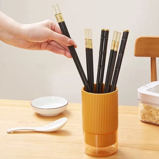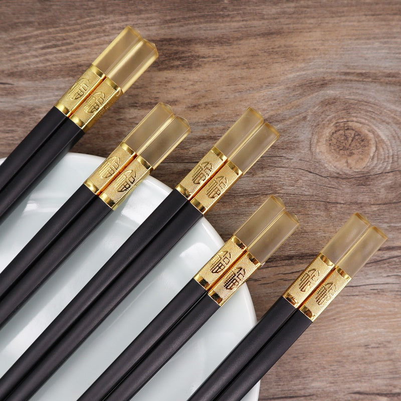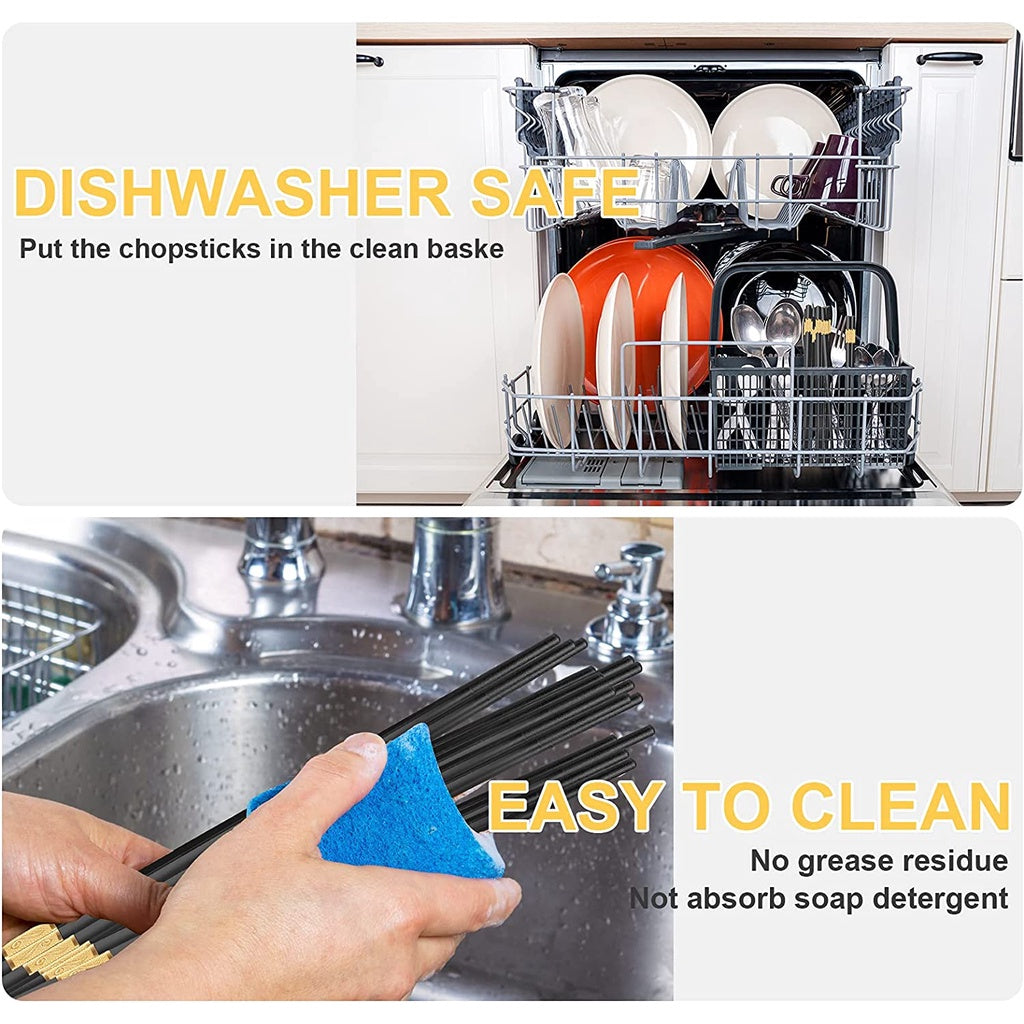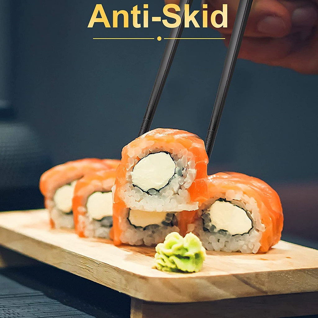 🍀🍀Unique Design:The top of the chopsticks is engraved with a golden pattern, which means happiness and good luck. Our chopsticks have DOUBLE NON-SLIP DESIGN - non-slip tips and anti-rolling squared body, this design can prevent the chopsticks from sliping through your fingertips or rolling on the table, making it easier to hold, even for first-time users, and the elongated, pointy, non-slip, frosted texture prevents food from falling off between your chopsticks.